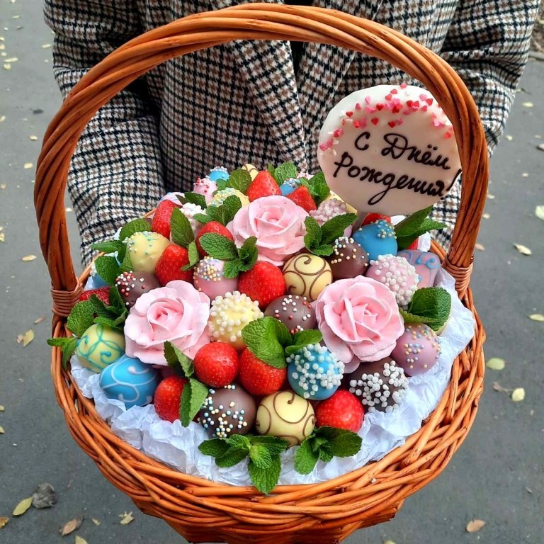 Состав: клубника, клубника в шоколаде, кейк-попсы, розы из клубничного зефира, медаль с надписью на выбор. Рассчитан на 3-4 человека. На фото диаметр 30-32 см.