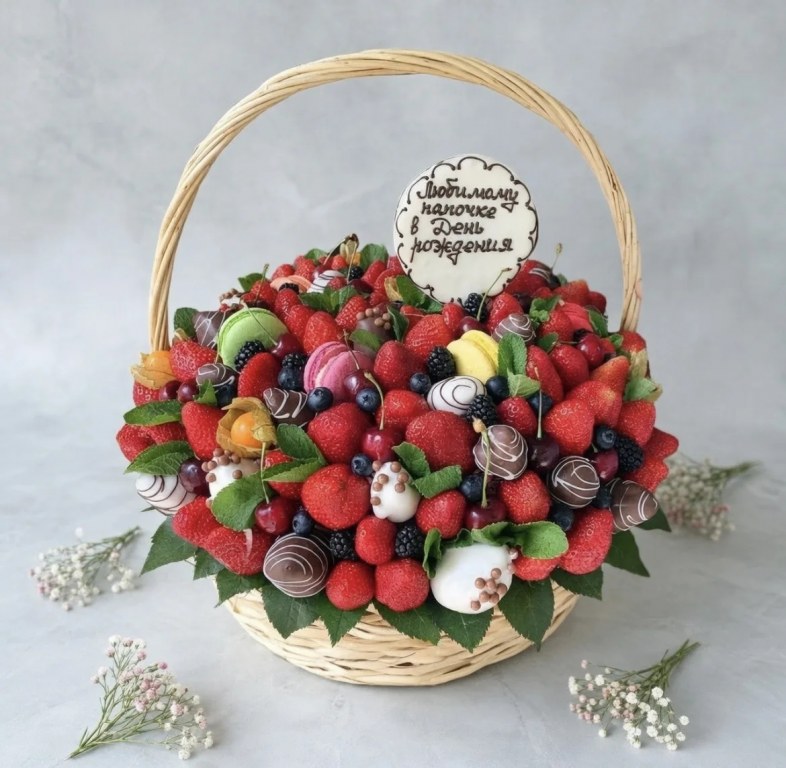 Состав: клубника, клубника в шоколаде, 3 вида ягод по наличию(ежевика, голубика, черешня, физалис), макаруны, мята, медаль в шоколаде с надписью на выбор. Рассчитана на 5-6 человек.
