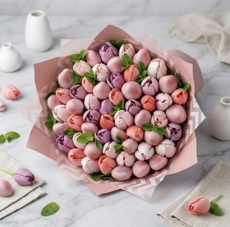 Состав: клубника в шоколаде 10 шт, кейкпопсы 10 штук, зефирные тюльпаны 35 шт. Рассчитан на 4-5 человек. Высота 35 см, диаметр 28 см.