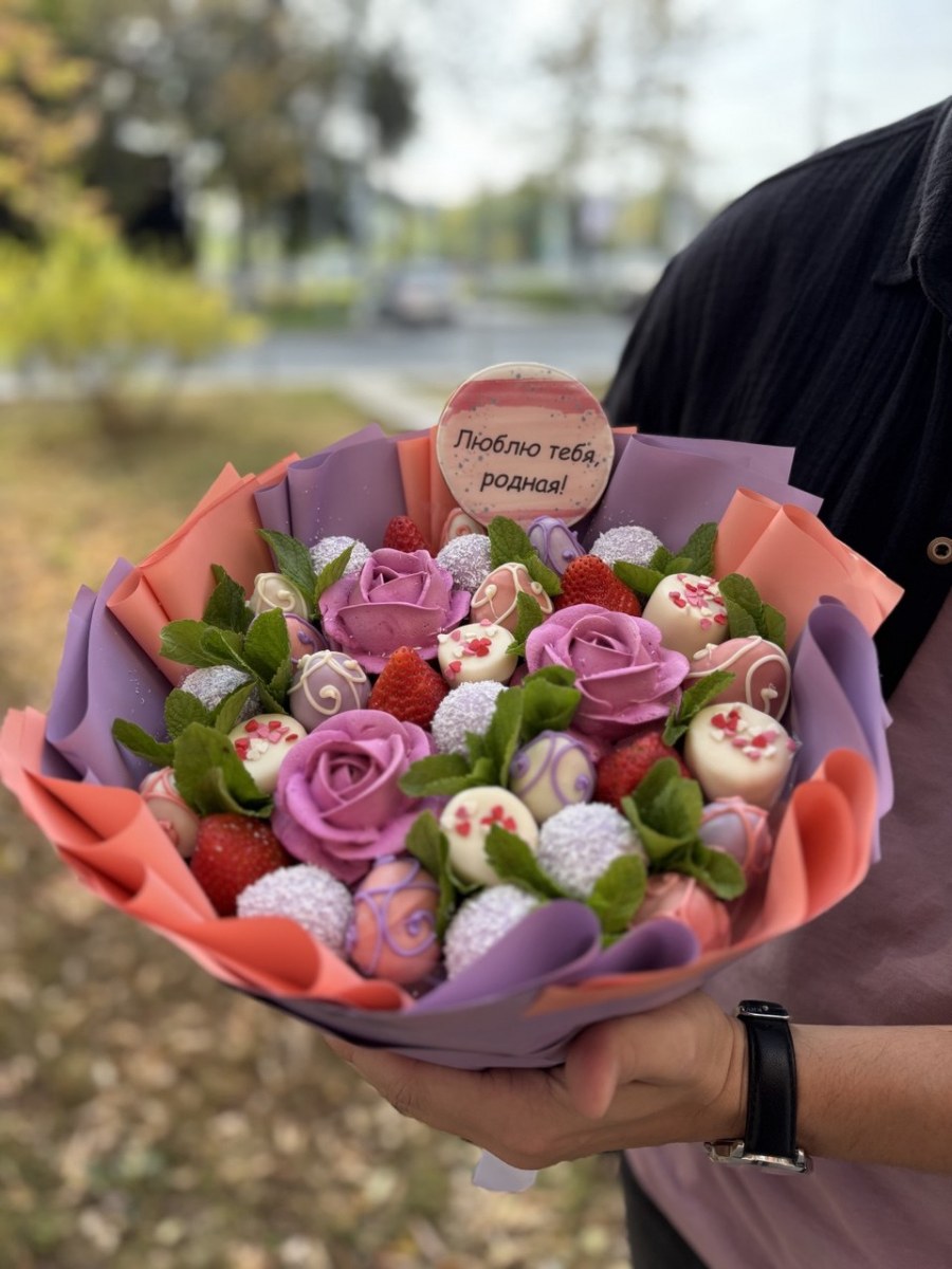 Состав: клубника, клубника в шоколаде, кейк-попсы, бананы в шоколаде, посыпки, зефирные розы. Надпись на прянике на выбор.