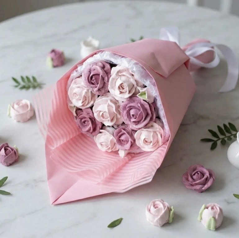 Состав: розы из клубничного зефира. На фото букет диаметр 14-15 см. Рассчитан на 1-2 человека. Высота 35 см.