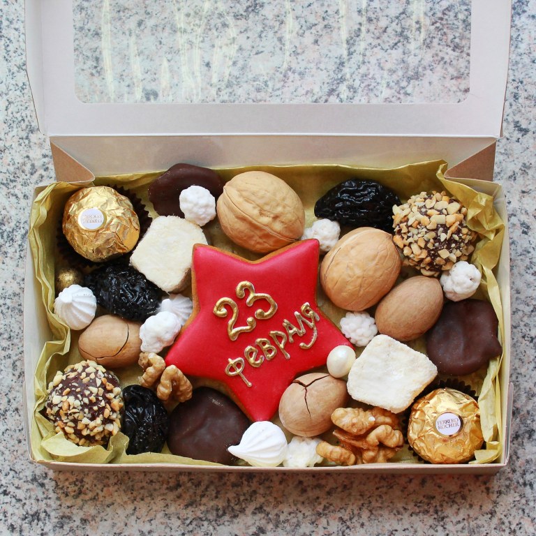 Состав: орехи грецкие, курага в шоколаде, чернослив, драже, арахис в кунжуте с мёдом, кейк-попсы, ферейро роше, безе, орехи пекан, рахат лукум, имбирный пряник звезда. Размер 20*12 см.