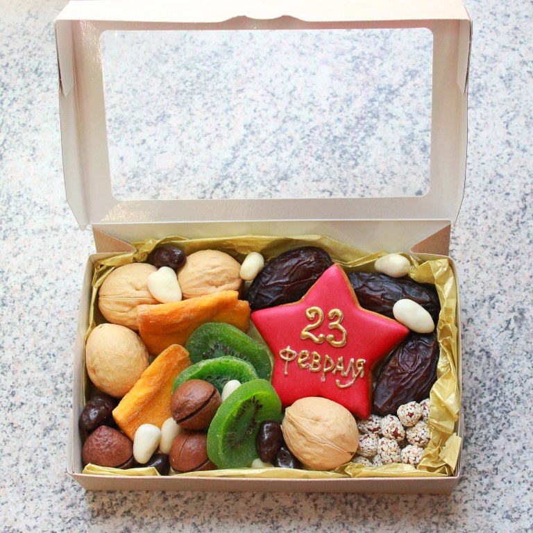 Состав: орехи грецкие, киви, манго, драже шоколадные, макадамия, финики королевские, арахис в кунжуте, пряник имбирный. Размер набора 20*12 см.