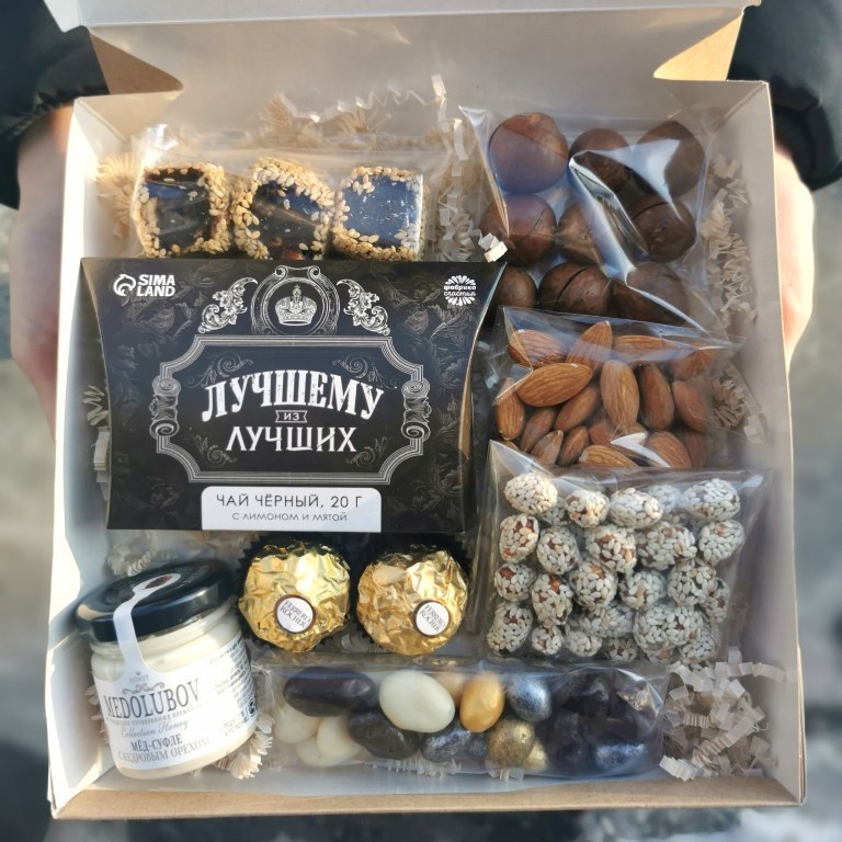 Состав: чай, орехи макадамия, миндаль, кешью, арахис в кунжуте с мёдом, драже Праздничное, ферейро роше, крем-мед, рахат лукум. На фото размер 20*20 см.