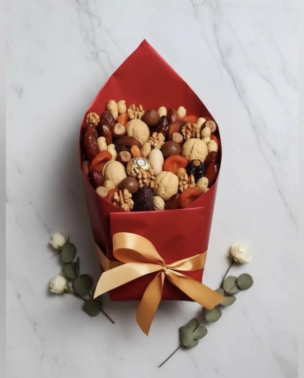 Состав: орехи грецкие, пекан, макадамия, арахис, миндаль, фундук, финики, курага, финики королевские, курага шоколадная, ферейро роше. Высота 30 см. Рассчитан на 2-3 человека.