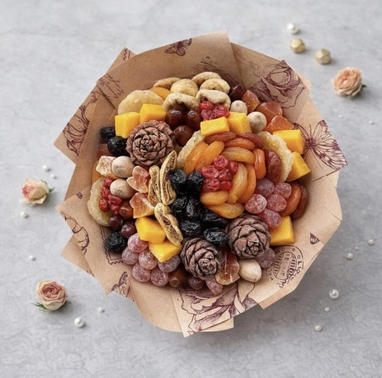 Состав букета: Инжир, курага, чернослив, финики, ананас сушеный, вишня сушеная, папайя, кумкват засахаренный, пекан в скорлупе, курага янтарная, конфеты из манго.