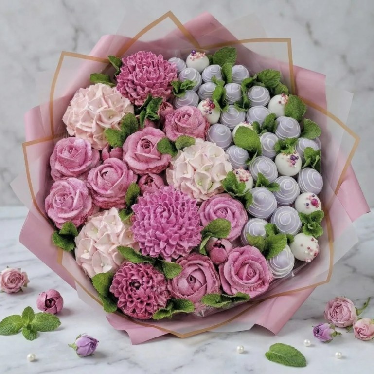 Состав: цветы из клубничного зефира 17-19 шт, клубника в шоколаде, кейк-попсы, мята. Диаметр 35 см, высота 35 см. Рассчитан на 5-6 человек.