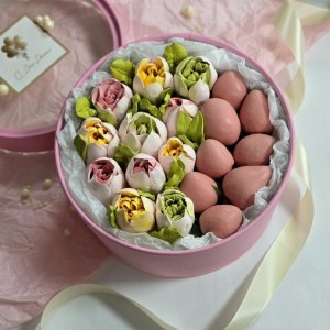 Клубника в розовом шоколаде - 8 штук, зефирные тюльпаны - 11 шт.